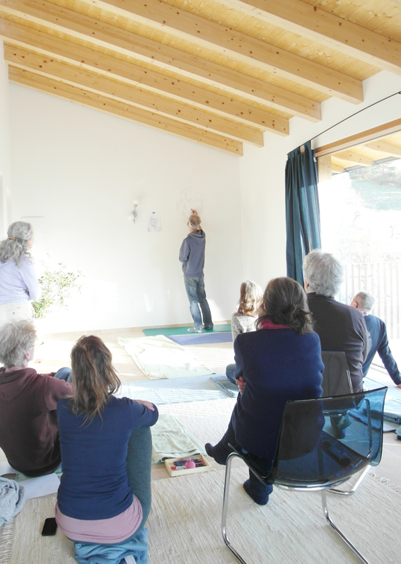 Die Anwesenden befanden sich auf der noch winterlich hellbraunen Wiese der Waldlichtung von Naone. Heinz Grill stellte die Frage, welche Ätherkräfte bzw. Elementarwesen wahrnehmbar sind. Obwohl die Ätherkräfte nicht mit den Sinnen oder den Emotionen wahrgenommen werden können, wurde zunächst die Betrachtung auf das konkret Sichtbare nach außen gerichtet. Der Boden wirkte kräftig und zentriert und es konnte eine ruhige Sphäre beobachtet werden. Heinz Grill stellte die Frage, ob der Boden so wirke, als ob die darin befindlichen Pflanzen sogleich hervorsprießen wollten. Die Anwesenden kam nach erneuter Betrachtung zu dem Ergebnis, dass die Wiese kraftvoll und gleichzeitig aber doch verschlossen und verhalten wirkte. Dies korrespondiere mit dem Wirken des Lebensäthers, der eine Zentrierung in die Erde hinein ausdrückt und eine ruhige weite Sphäre nach oben entfaltet. Heinz Grill wies jedoch darauf hin, dass man über den reinen Sinneseindruck noch nicht die Ätherkräfte sehen könne. Man benötige wiederholte Beobachtungen um diese unsichtbaren Kräftewirkungen wahrnehmen zu lernen. Ein Student bemerkte nach den Betrachtungen eine Kräftigung bei allen und ein besseres und ruhiges in Beziehung-stehen zu den anderen.