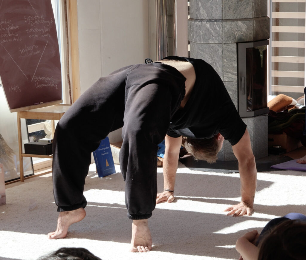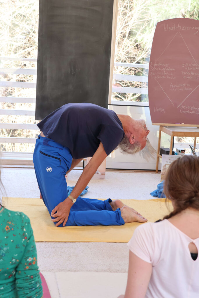 Heinz Grill demonstriert eine grundlegende und eine weitergeführte Ausgestaltung des Kamels (ustrasana) – ein schönes Entwicklungsziel ist die gute Mittenformung im Bereich des dritten Zentrums.